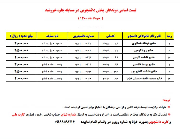 6) ارسال تصاویر کارت دانشجویی ، کارت ملی و شماره شبای بانکی به نام خود دانشجو برای برندگان و در موعد مقرر، الزامی است.